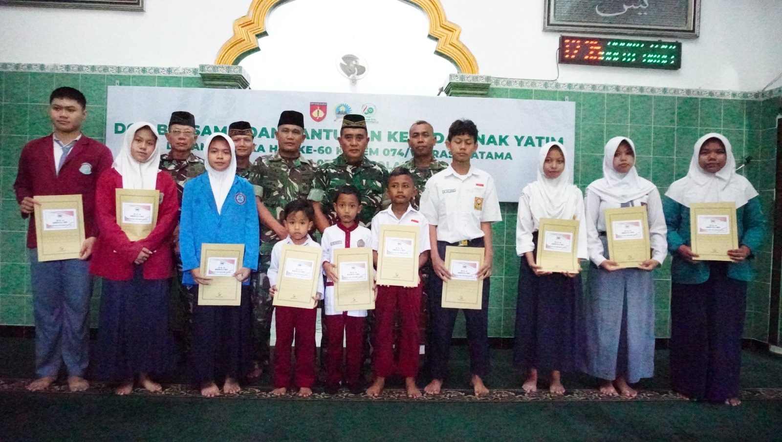 BOYOLALI – Suasana khusyuk dan penuh kehangatan menyelimuti Masjid Ar-Rahman Makodim 0724/Boyolali, Senin (27/04/26). Dalam rangka memperingati HUT ke-60 Korem 074/Warastratama, keluarga besar Kodim 0724/Boyolali menggelar doa bersama yang dirangkai dengan bakti sosial berupa santunan kepada anak-anak yatim. Kegiatan ini menjadi momen refleksi sekaligus penguatan nilai kemanusiaan di tengah padatnya tugas pengabdian prajurit.