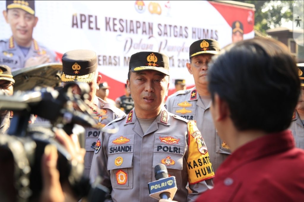 Jakarta. Kadiv Humas Polri Irjen. Pol. Sandi Nugroho memimpin apel gelar pasukan kesiapan Satgas Humas Ops Mantap Brata 2023. Operasi tersebut digelar dalam rangka pengamanan Pemilu 2024.
