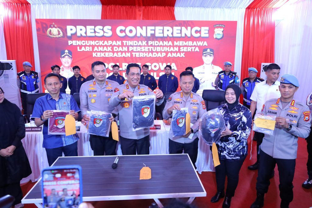 GOWA, – Kapolda Sulawesi Selatan Irjen Pol. Djuhandhani Rahardjo Puro, S.H., M.H., memimpin Press Conference pengungkapan tindak pidana membawa lari anak, persetubuhan dan/atau perbuatan cabul terhadap anak, serta kekerasan di Mapolres Gowa, Selasa (09/12/2025).