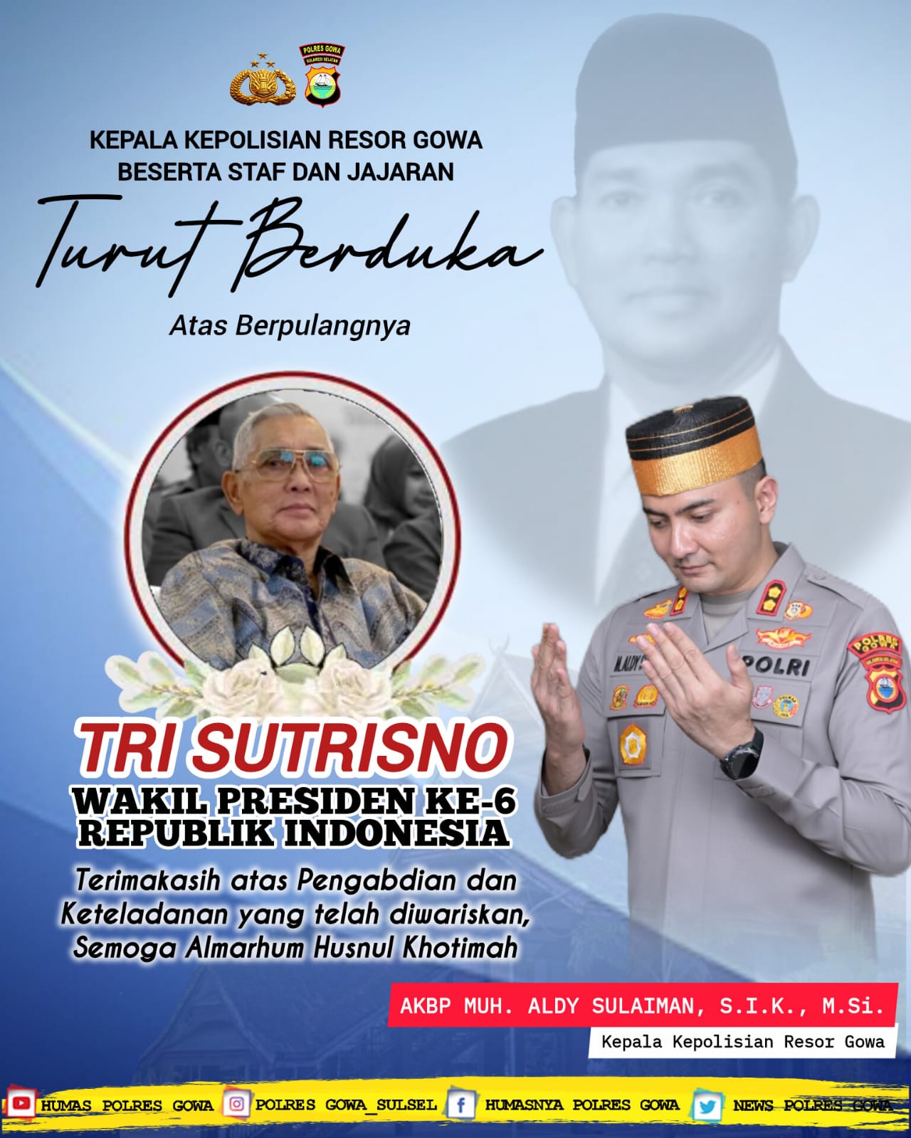 GOWA, -Kepala Kepolisian Resor Gowa, AKBP Muhammad Aldy Sulaiman, S.I.K., M.Si., beserta staf dan seluruh jajaran Polres Gowa menyampaikan turut berduka cita yang mendalam atas berpulangnya Wakil Presiden ke-6 Republik Indonesia, Tri Sutrisno, Senin (02/3/2026).