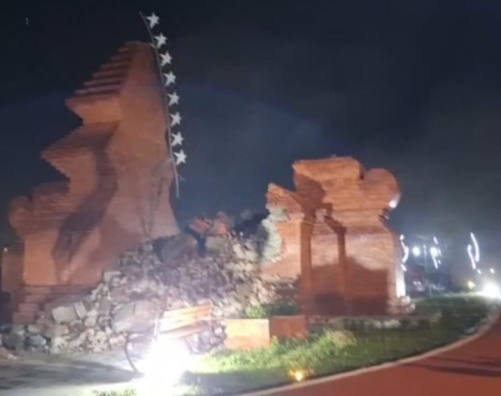 ARAHBARU Cirebon – Gapura Alun-alun Pataraksa di Kabupaten Cirebon ambruk saat terjadi hujan pada Selasa (2/1/2024) tadi malam. Ambruknya gapura tersebut pun menjadi perbincangan di media sosial (medsos) dan grup-grup WA.