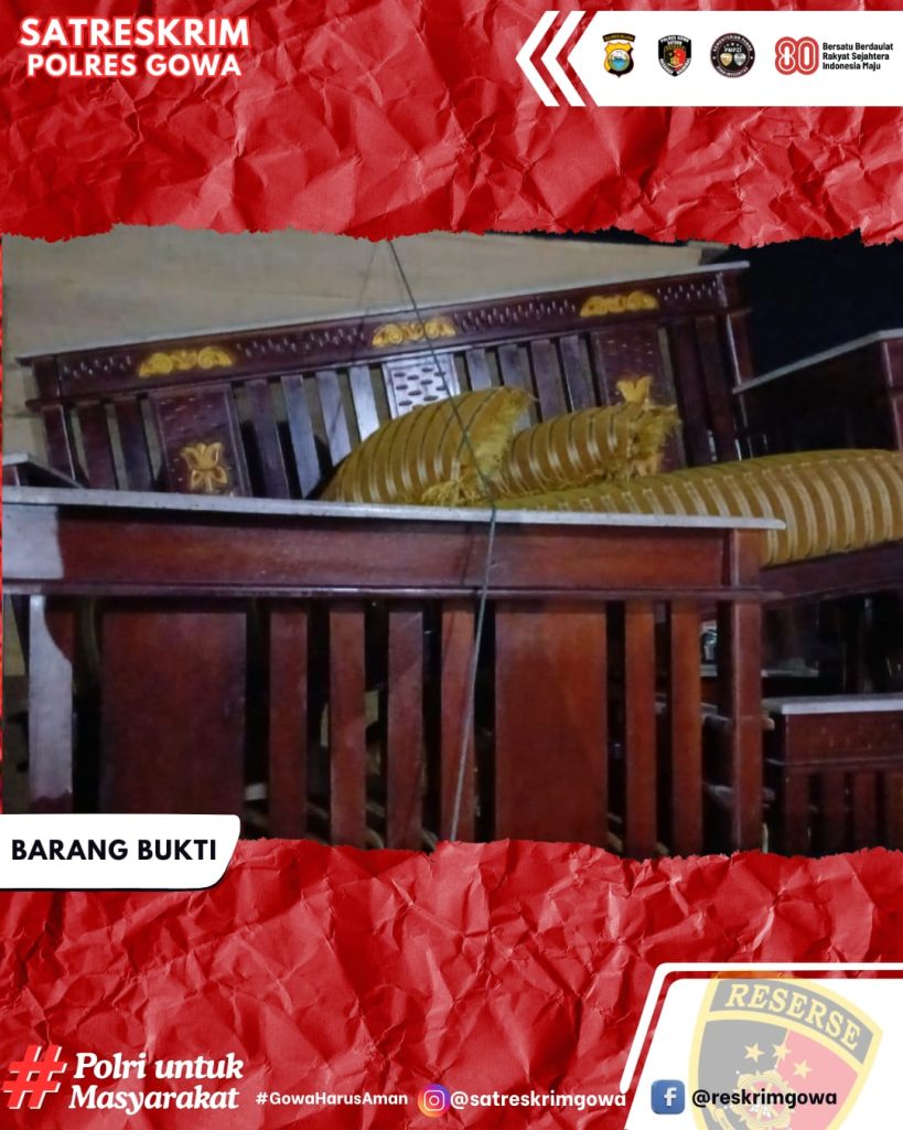 Polisi turut mengamankan barang bukti berupa 1 (satu) buah lemari kaca 4 pintu, 3 (tiga) buah kursi kayu, dan 1 (satu) unit mobil Grandmax warna putih DD 8142 DF.