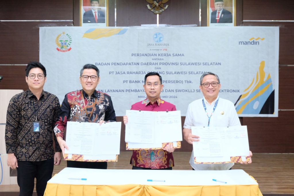 MAKASSAR, – Kepala PT Jasa Raharja Cabang Sulawesi Selatan, M. Iqbal Hasanuddin bersama dengan Kepala Badan Pendapatan Daerah Provinsi Sulawesi Selatan, H. Reza Faisal Saleh, melaksanakan penandatanganan perjanjian kerja sama dengan PT Bank Mandiri (Persero) Tbk tentang penyediaan Layanan Pembayaran PKB dan SWDKLLJ secara elektronik.