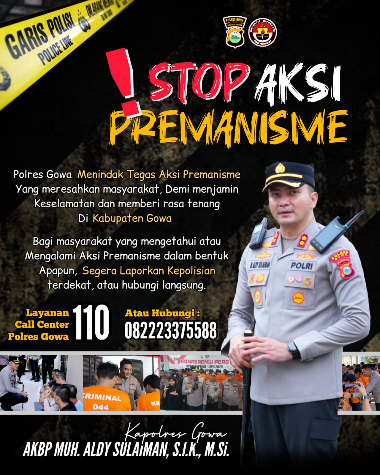 Kapolres Gowa melalui jajarannya menyampaikan bahwa setiap tindakan premanisme, baik pemalakan, intimidasi, kekerasan, maupun segala bentuk keresahan sosial lainnya tidak akan ditoleransi. Polisi akan merespons cepat setiap laporan masyarakat dan menindak tegas pelaku sesuai ketentuan hukum.