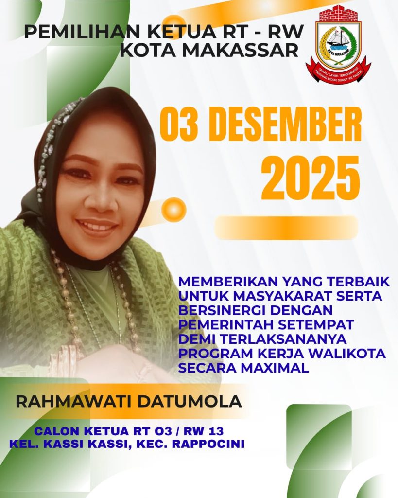 MAKASSAR, – Kelurahan Kassi-Kassi, Kecamatan Rappocini, Makassar tengah memasuki suasana pemilihan Ketua RT dan Ketua RW yang semakin dinamis. Dalam beberapa pekan terakhir, perhatian warga tertuju pada satu nama yang tidak asing lagi: Rahmawati Datumola, atau yang akrab disapa Bu Rahma. Sosok perempuan aktif dan berdedikasi ini resmi mendeklarasikan diri sebagai calon Ketua RW 13, membawa optimisme baru serta harapan perubahan bagi masyarakat setempat.